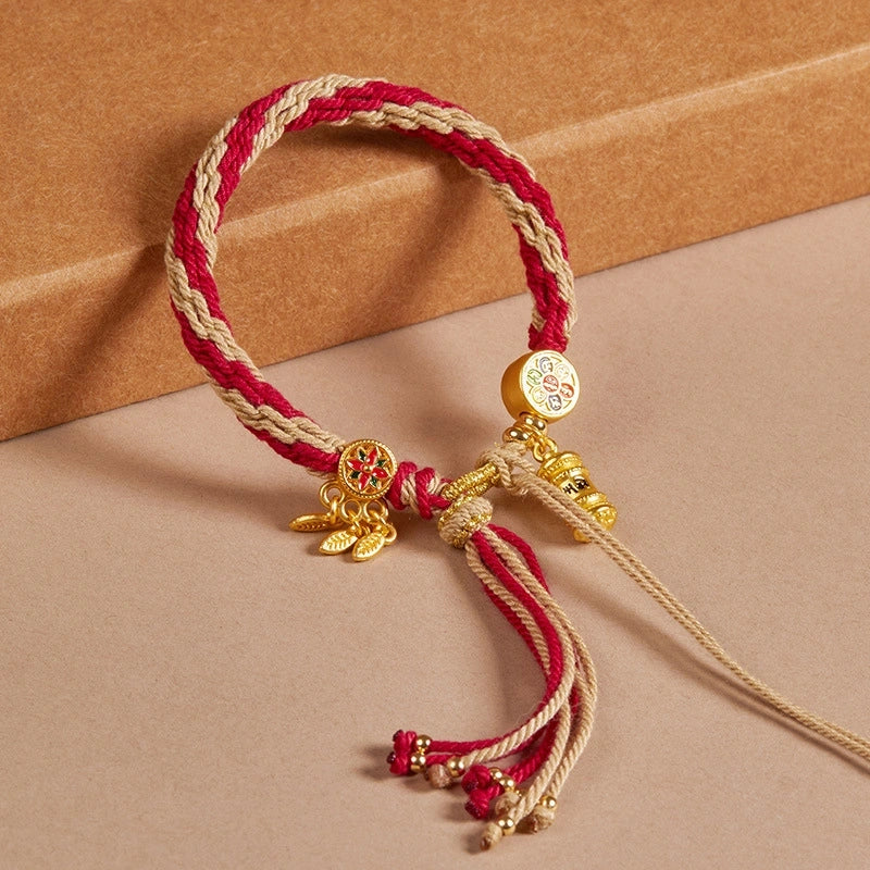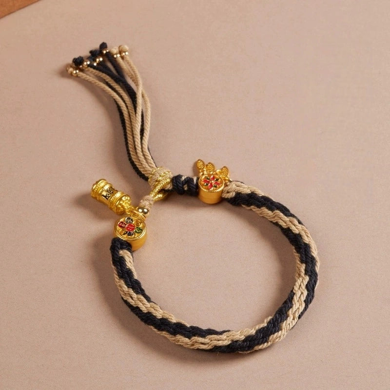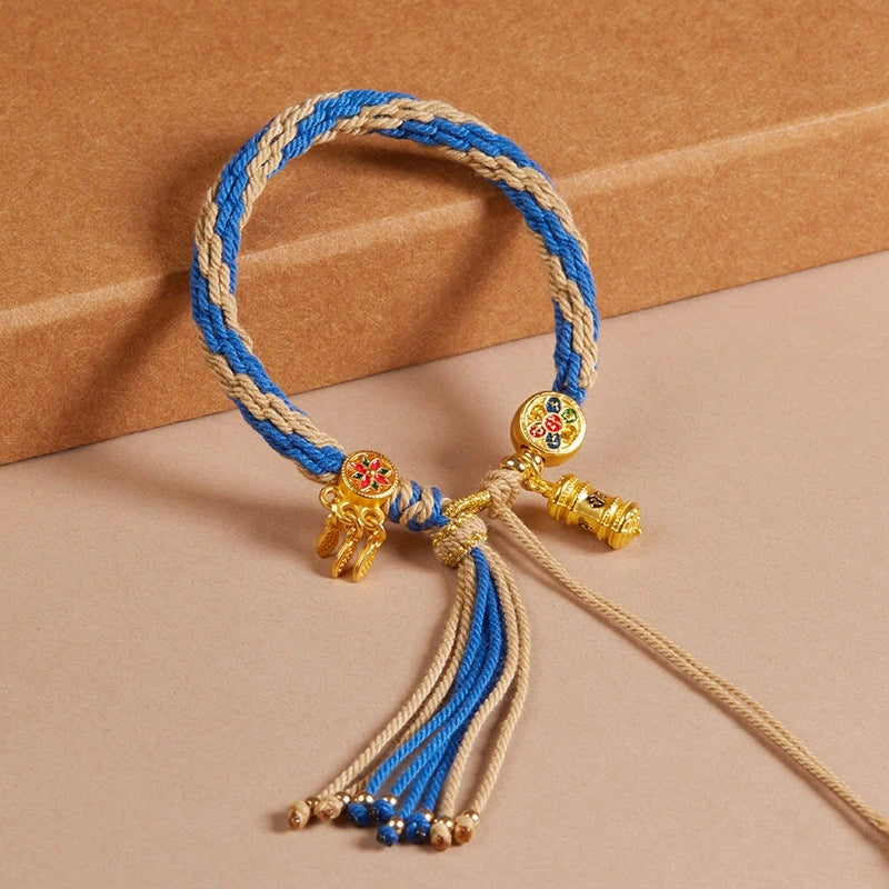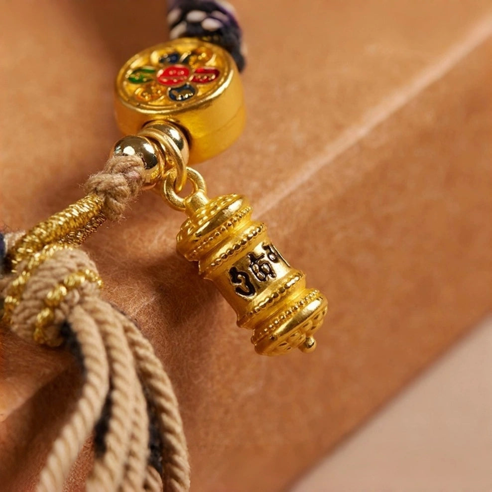 Handcrafted via two-tone cotton braiding (adjustable, 6mm thick), this bracelet pairs soft cotton (Wood Element: gentle calm) with metal Six-Syllable Mantra, dreamcatcher, and prayer wheel (Metal Element: in Tibetan Buddhism, they bring calm, shield negativity, and purify energy). Blending spiritual wisdom with modern style, it offers daily emotional calm and empowerment for modern women.