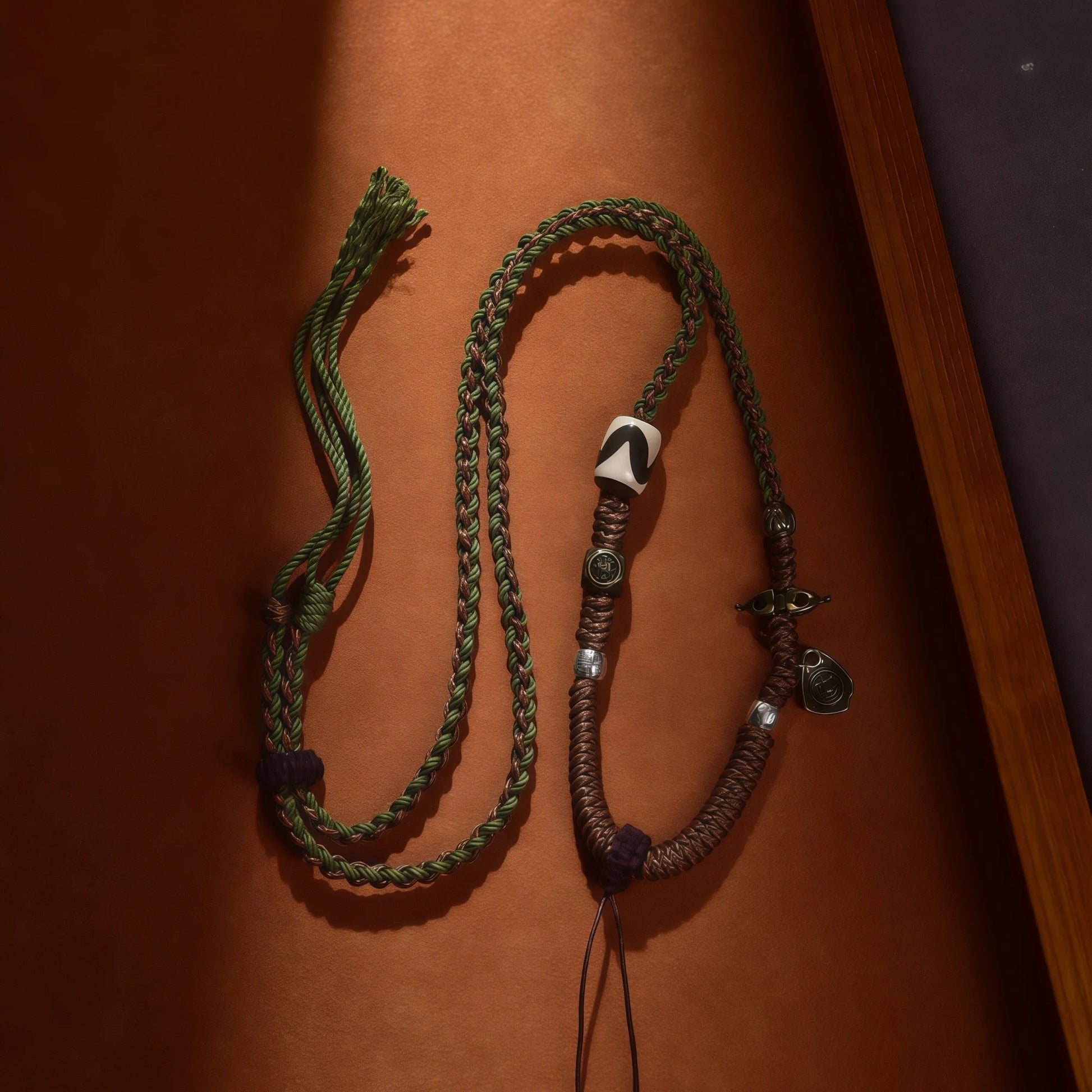 Embrace powerful spiritual protection with this deeply meaningful handmade necklace featuring the Four Celestial Guardians. Expertly crafted from 100% cotton in sophisticated deep green, brown, and bronze tones, this 70cm adjustable necklace combines ancient Chinese mythology with Tibetan spirituality. The centerpiece showcases four bronze guardian deity square beads that ward off negative energies and dissolve karmic obstacles. Complemented by vintage bronze lotus flowers and vajra symbols representing Buddha's compassion and supreme power, plus an authentic tiger tooth Dzi bead adding authentic Tibetan character. Complete with additional pendant knot for your favorite pendants and free custom engraving service.