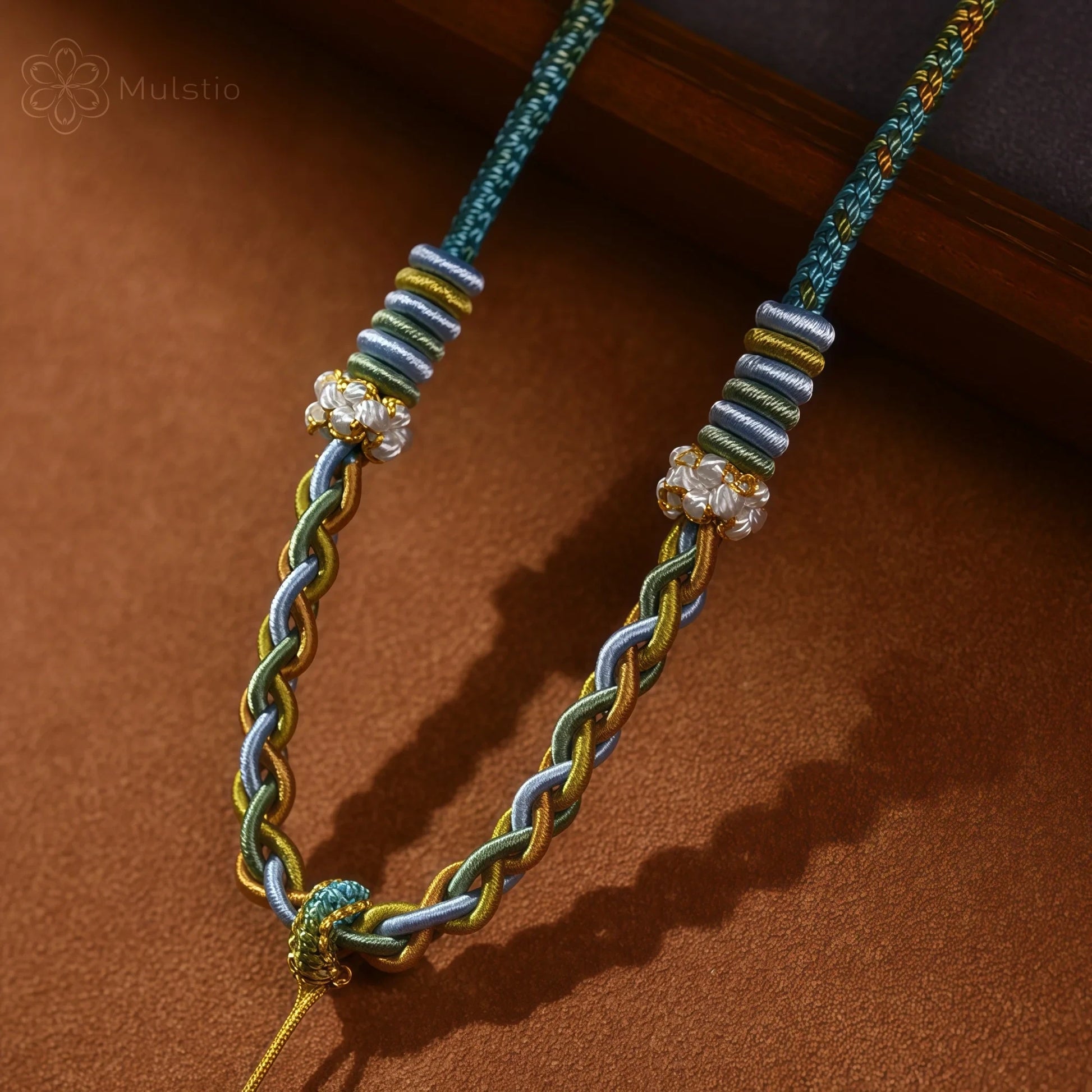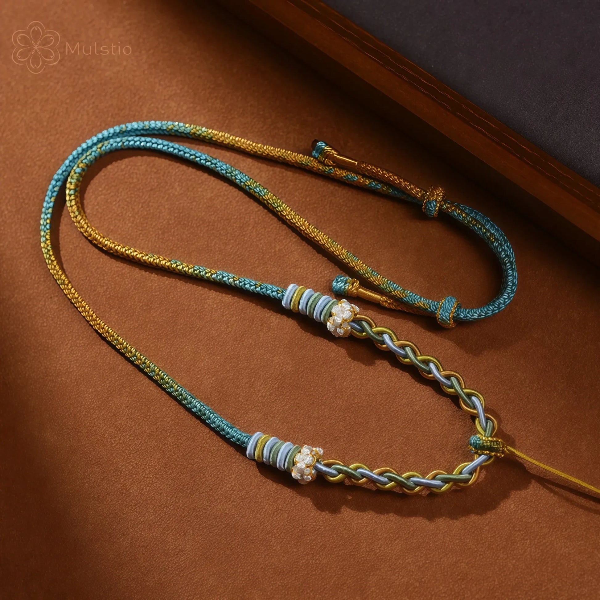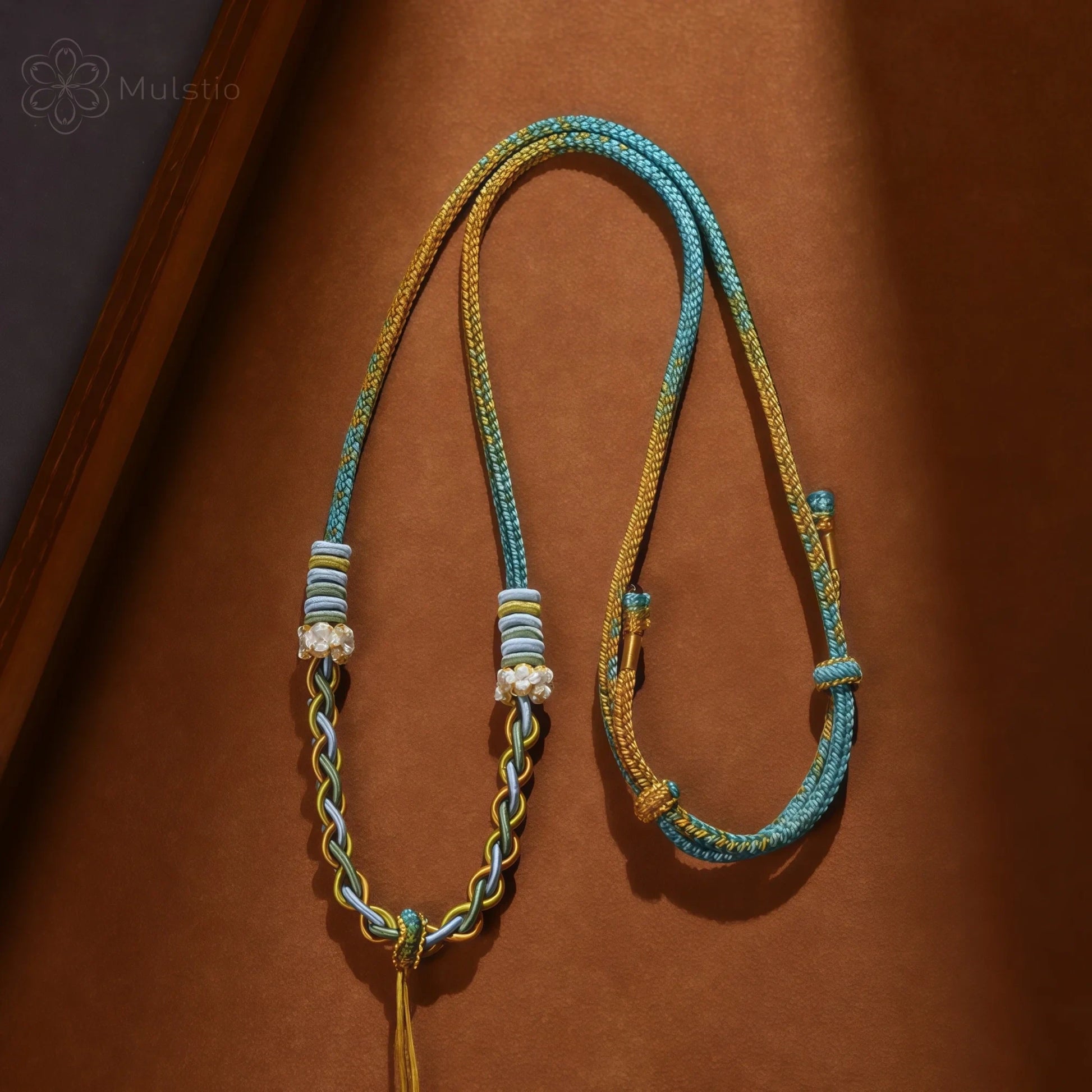 Inspired by the iconic Chinese painting "A Thousand Li of Rivers and Mountains," this exquisite necklace cord is hand-braided by Tibetan artisans. It features a beautiful blue-to-yellow gradient, crafted from 92% cotton and 8% polyester. With a 3mm thickness, it's adorned with intricate circle and cloud-shaped knots. The mid-section showcases complex 3D stacked weaving, and it includes an open knot, allowing you to personalize it with your own pendants like Thangka plaques, jade, or amber. A wearable art piece that carries the spirit of ancient landscapes.