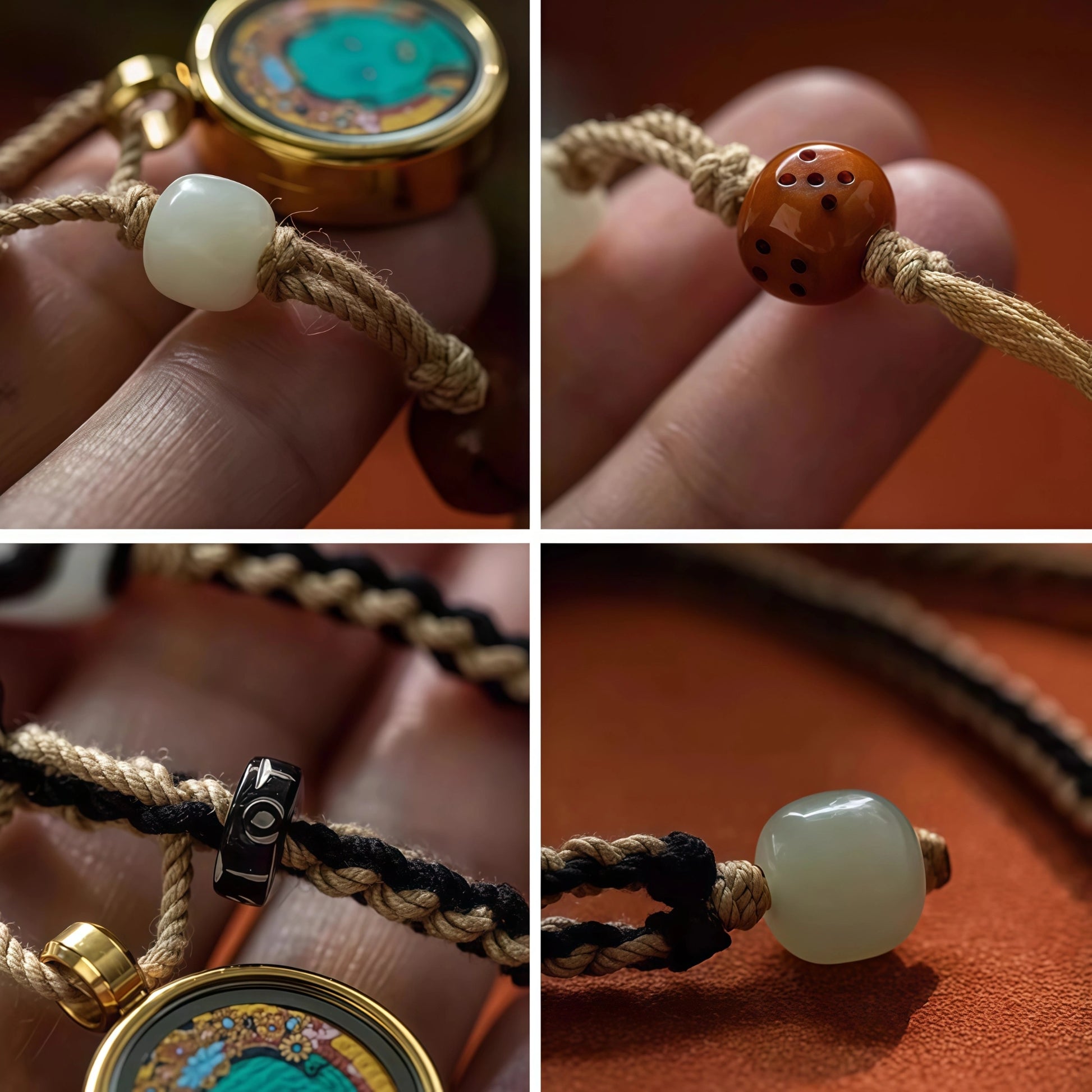 Features: Complex knot patterns, asymmetric tassels, multiple natural materials, open pendant knot, free custom tag