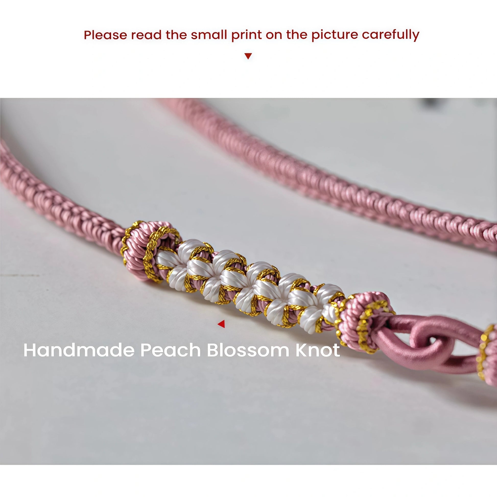 A delicate masterpiece of love and artistry, this enchanting necklace is meticulously handwoven by skilled artisans, a process so intricate it takes a full day to complete just one piece. Crafted from a blend of 92% cotton and 8% polyester in a soft palette of pink, white, and gold, the 70cm cord intricately combines nine different traditional knots. The design features exquisite peach blossoms, leaves, and a central 'Love Knot' (Tongxin Jie), all symbolizing blossoming romance, enduring love, and heartfelt wishes for relationships. The versatile open knot allows you to personalize it with your own pendants, such as a crystal, jade, or amber, making it a deeply personal talisman for the heart.