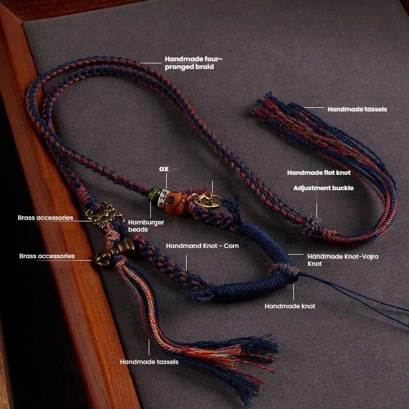Product Introduction:Rooted in Tibetan Buddhist traditional craftsmanship, this necklace features handwoven four-pronged braids, sacred Vajra Knot (a core Tibetan symbol for protection & negative energy dispelling), brass accessories (Metal Element, prosperity), ox bone (Earth Element, resilience), and handcrafted tassels. The mix of traditional knots, earthy tones, and adjustable design merges cultural authenticity with daily wearability—ideal for those seeking spiritual connection, Tibetan wisdom, and handcrafted ethnic charm.