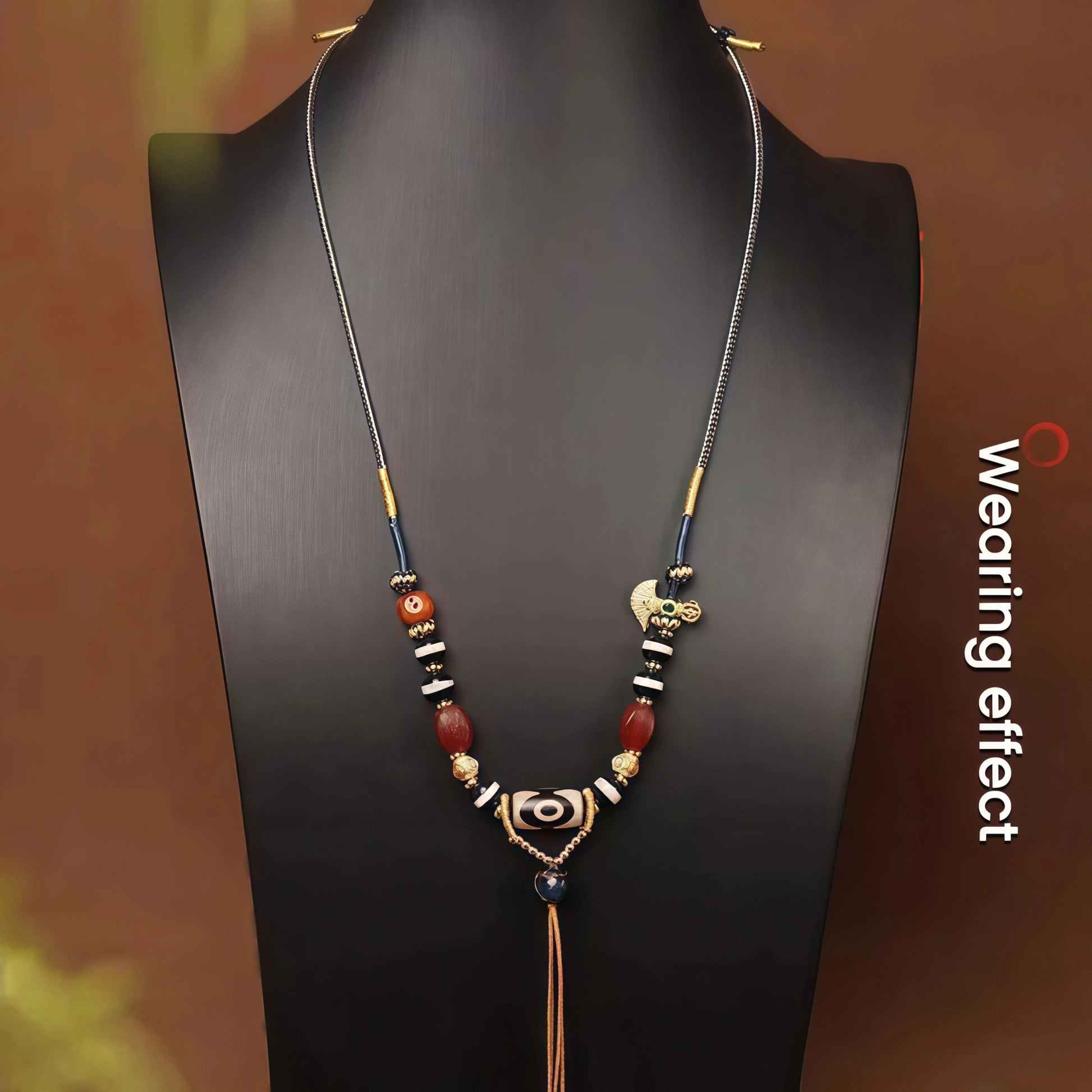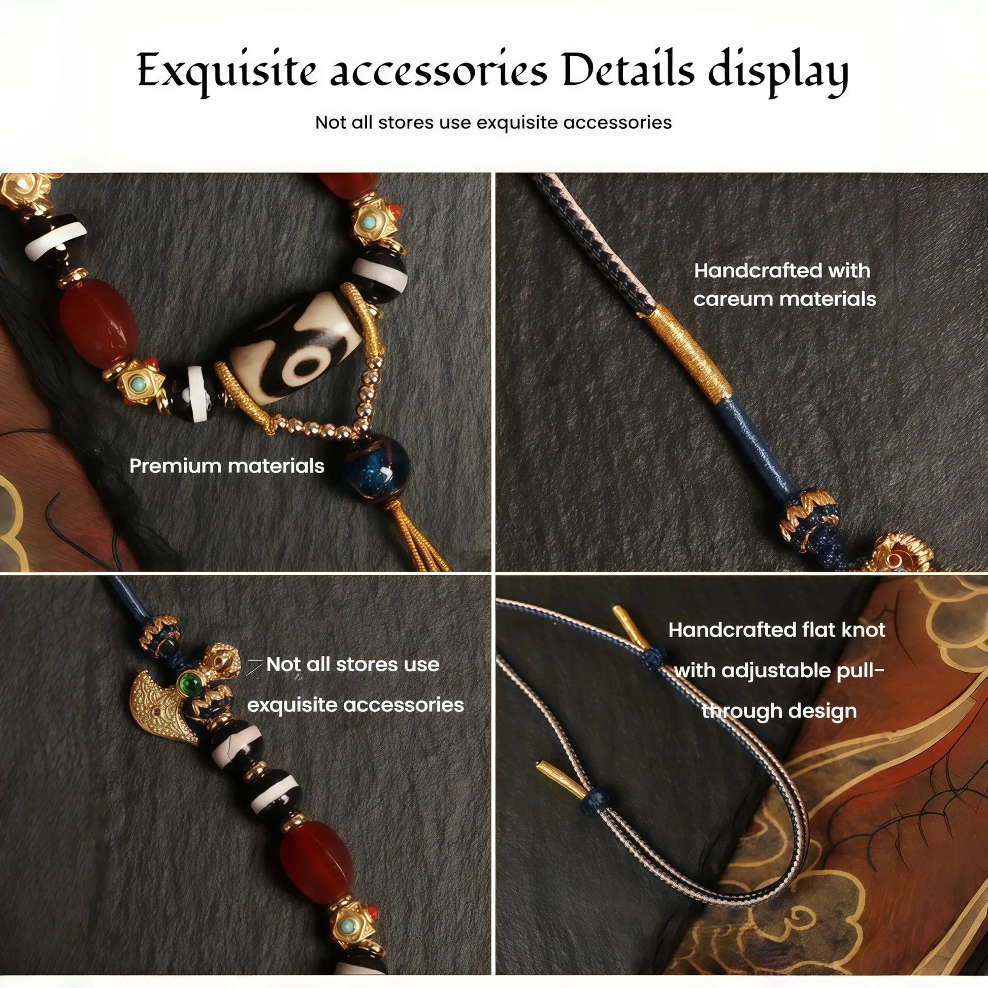 - Features: Three traditional knots, Three Eyes Dzi Bead, red agates, golden accessories, handmade ash-glazed glass bead, one open knot.